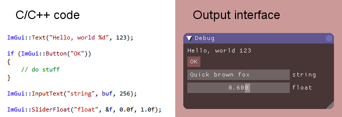 ImGui is a bloat-free graphical user interface library for C/C++. It is portable, renderer agnostic and carries minimal amount of dependencies (only 3 files are needed). It is based on an "immediate" graphical user interface paradigm which allows you to build simple user interfaces with ease.