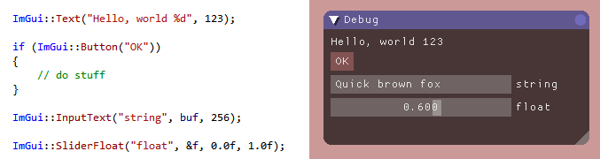 ImGui is a bloat-free graphical user interface library for C/C++. It is portable, renderer agnostic and carries minimal amount of dependencies (only 3 files are needed). It is based on an "Immediate" graphical user interface paradigm which allows you to build simple user interfaces with ease.